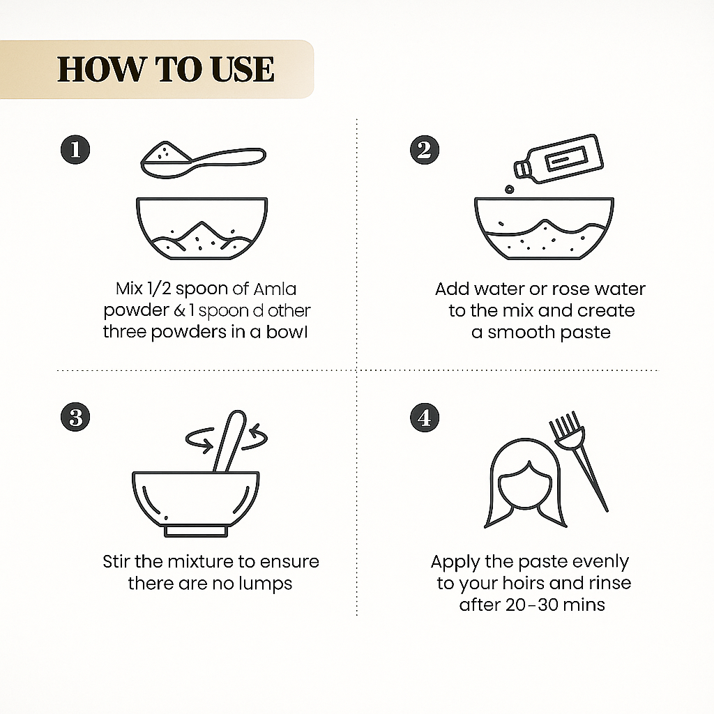 This potent 5-in-1 herbal hair care combo is a complete solution for hair growth, damage repair, dandruff control, and natural conditioning. Each powder plays a critical role in reviving lifeless hair and restoring scalp health without any side effects.